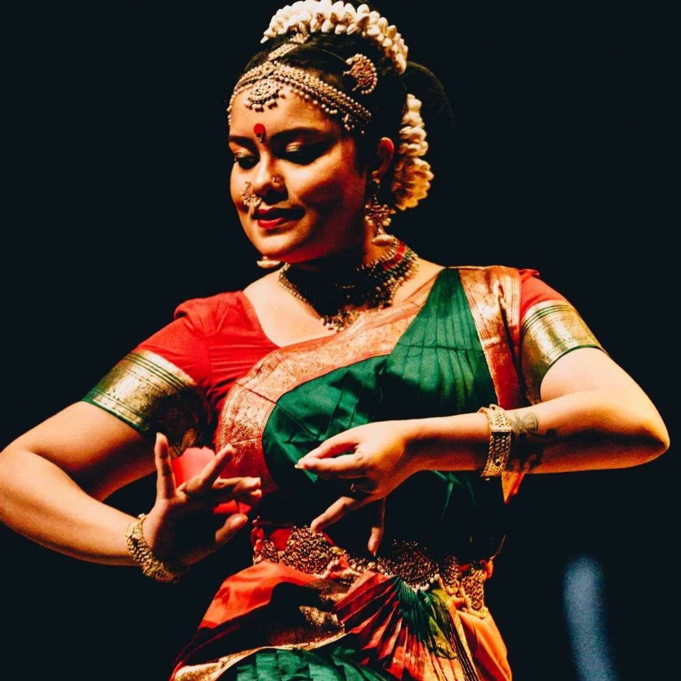 这支婆罗多舞(Bharatanatyam)作品透过一首Ragamalika旋律展现了克里希纳神(Krishna)的俏皮美丽与神圣力量。从孔雀羽毛的顽趣游戏,到战胜毒蛇卡利亚(Kaliya),再到《薄伽梵歌》(Geetopadesha)传递的智慧,整场表演涵盖了克里希纳丰富而深邃的精神。