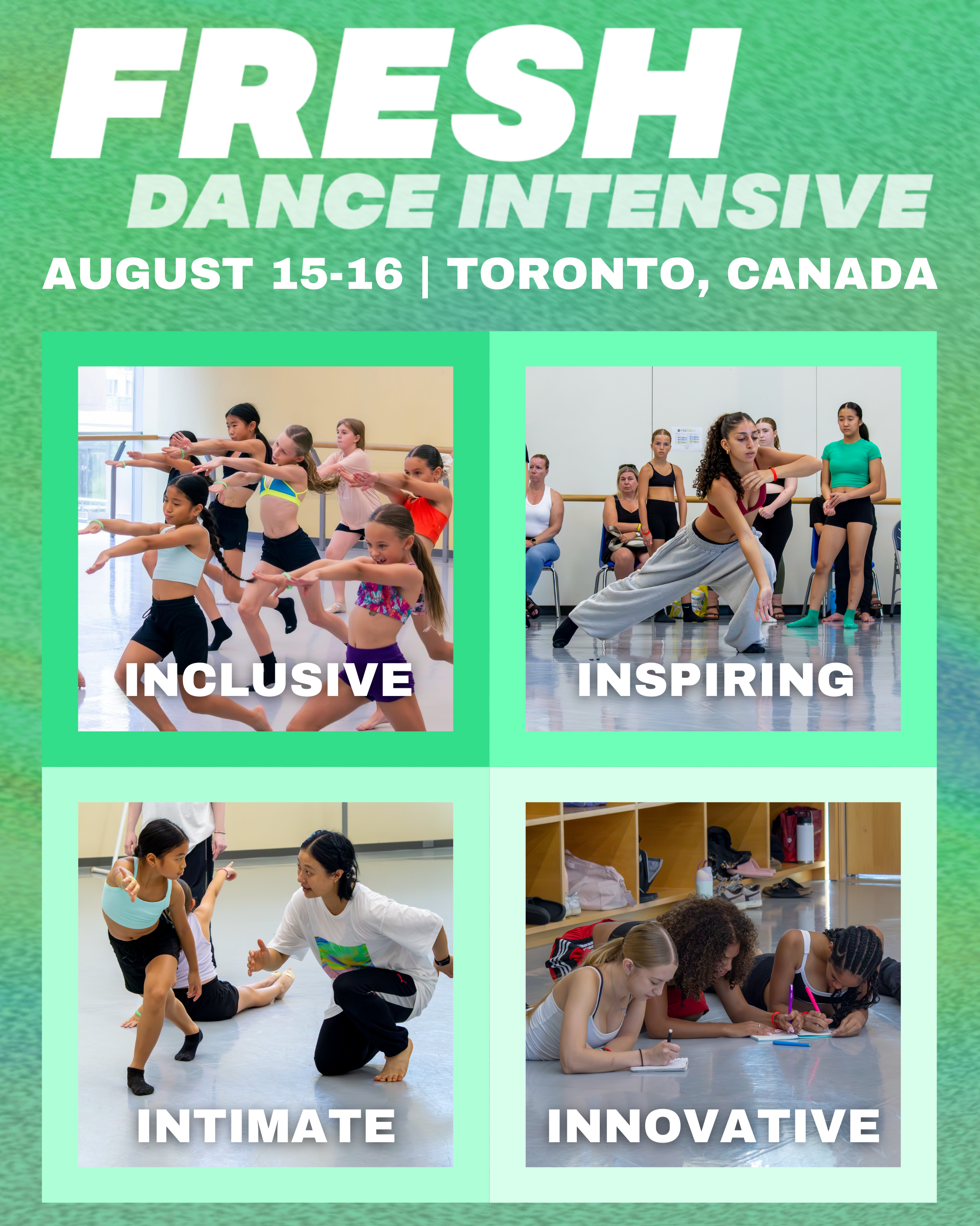 If you’re not sure which level would be best for you/your child, please ask a dance teacher at your studio for a recommendation. We want to facilitate an experience for you that is enjoyable, but also challenging and educational. Remember: Fresh isn’t primarily focused on dance technique or tricks— it’s about expression, community, and taking risks… So the types of challenges you will encounter at Fresh might require you to dive deeper into your artistry or think differently about dance.
